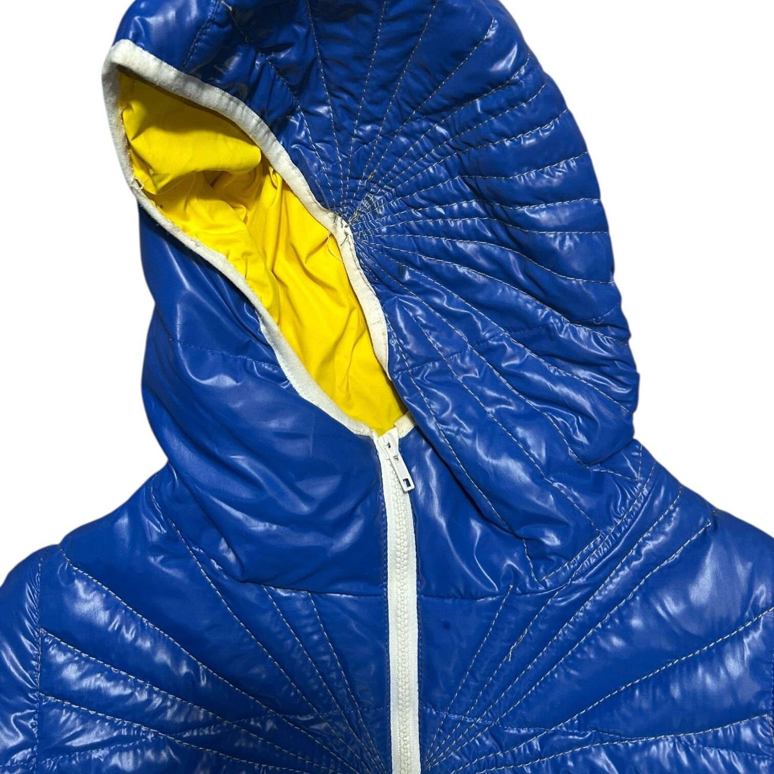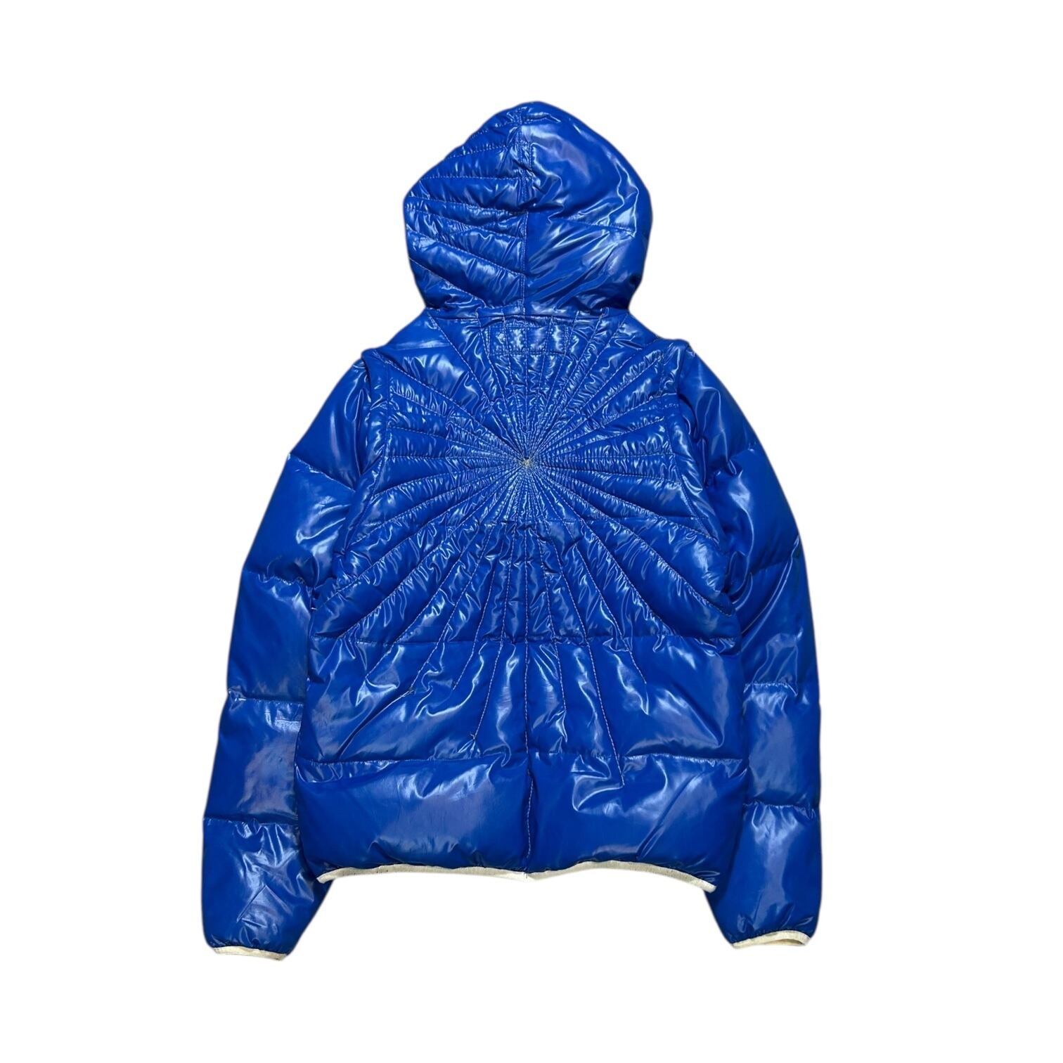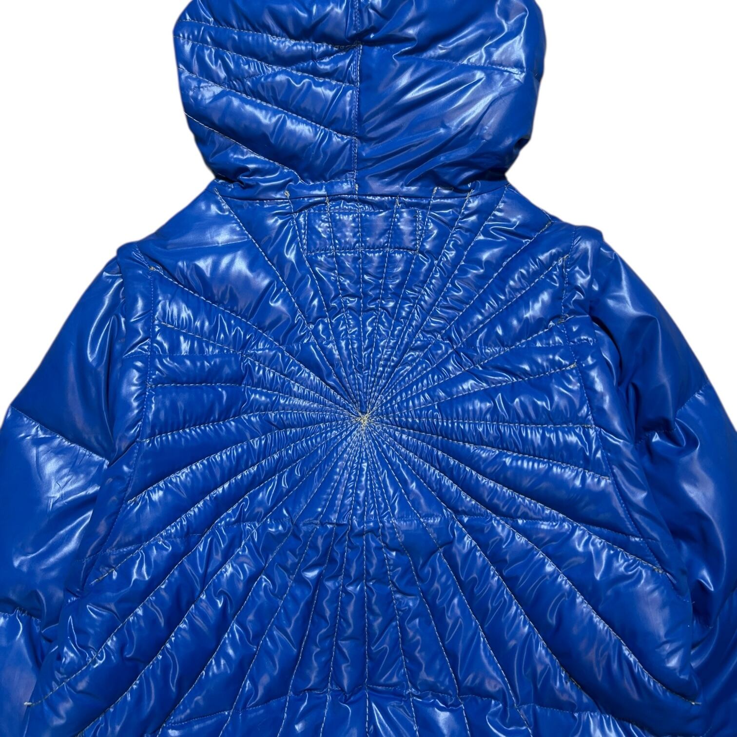 鮮やかなブルーのボディに、放射状のステッチワークが印象的な中綿ジャケット。
